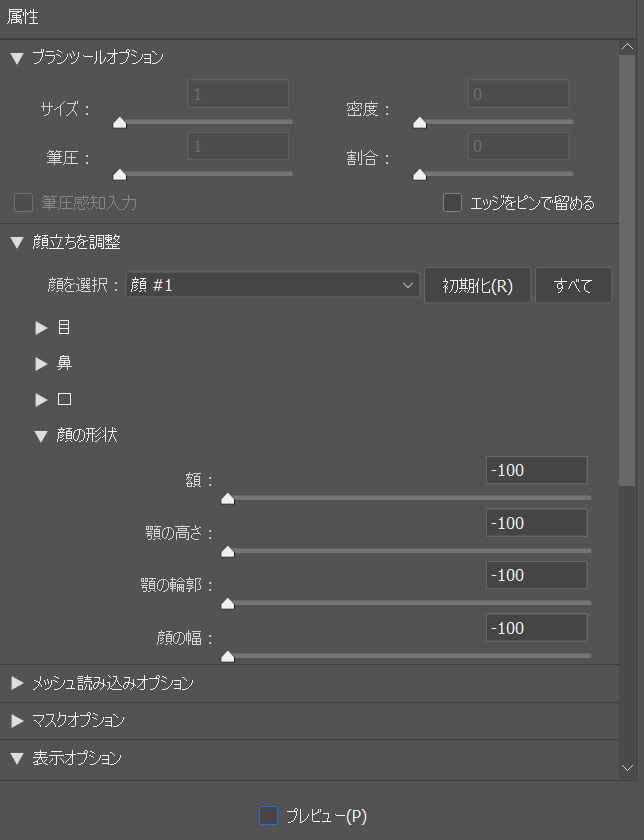 次に「属性→顔だちを調整→顔の形状」の部分で、額・顎の高さ・顔の輪郭・顔の幅を